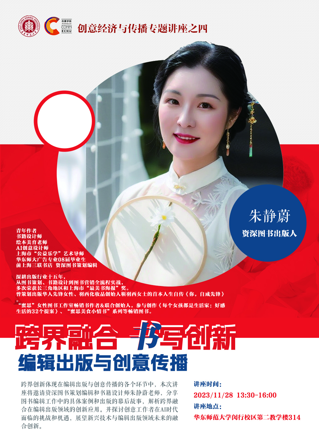 跨界创新体现在编辑出版与创意传播的各个环节中,本次讲座将邀请资深图书策划编辑和书籍设计师朱静蔚老师,分享图书编辑工作中的具体案例和出版的幕后故事,解析跨界融合在编辑出版领域的创新应用。并探讨创意工作者在AI时代面临的挑战和机遇,展望新兴技术与编辑出版领域未来的融合创新。