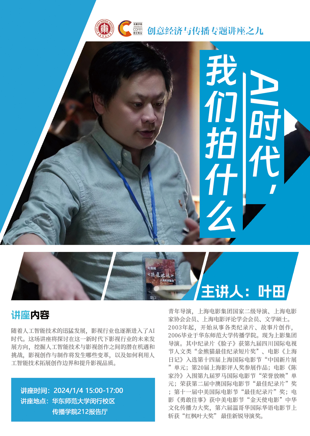 叶田,青年导演,上海电影集团国家二级导演、上海电影家协会会员、上海电影评论学会会员、文学硕士。